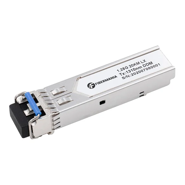 1.25Gbps SFP LX transceiver with 1310nm FP transmitter and PIN receiver, supporting single-mode fiber links up to 20km.