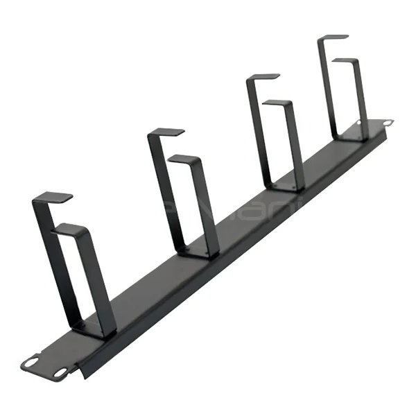 This panel features four closable metal D-rings, allowing cables to be securely routed and contained, preventing tangling and improving airflow within the rack. Its compact 1U height makes it suitable for both small and large installations.