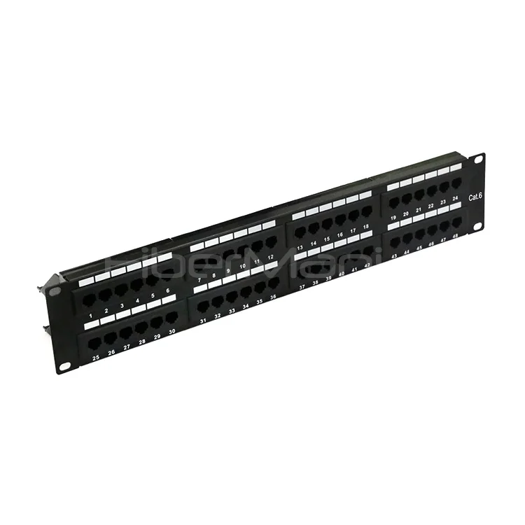 This 48-port CAT6 UTP patch panel is engineered for high-density copper cabling installations that demand robust performance, organized layout, and long-term stability. Designed in a 2U form factor, it provides double the port capacity of a standard 1U panel, making it ideal for large-scale enterprise networks, data centers, and telecom distribution frames requiring efficient port consolidation. Its 1.5 mm SPCC steel construction ensures excellent rigidity and durability, allowing the panel to withstand continuous use in professional IT environments.