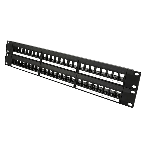 This 19-inch 2U UTP blank patch panel with 48 ports is designed to provide a versatile and organized interface for structured cabling installations. Its durable 1.5mm steel body combined with plastic front panels ensures long-lasting performance while maintaining a lightweight structure. The panel is equipped with clear label markings to simplify port identification and streamline network management, making it ideal for data centers, enterprise networks, and telecommunication environments.