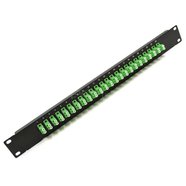1U 19-inch adapter panel preloaded with 24 LC/APC duplex single mode adapters, offering high-density and stable fiber distribution for data centers and telecom systems.