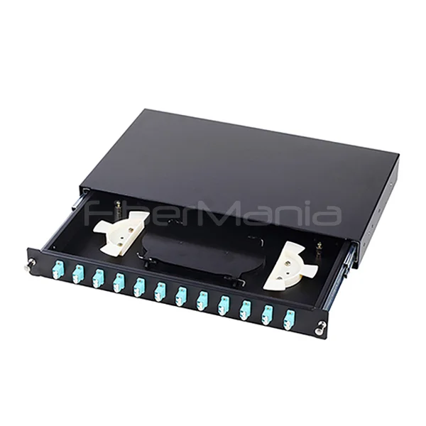 1U 19’’ sliding fiber optic patch panel with 12 LC duplex OM3 adapters