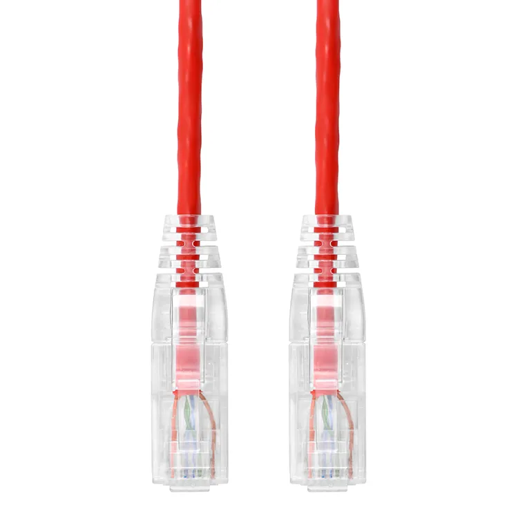 Red CAT.6A UTP slim patch cable, 28AWG stranded copper, supports 10Gbps Ethernet in compact installations.