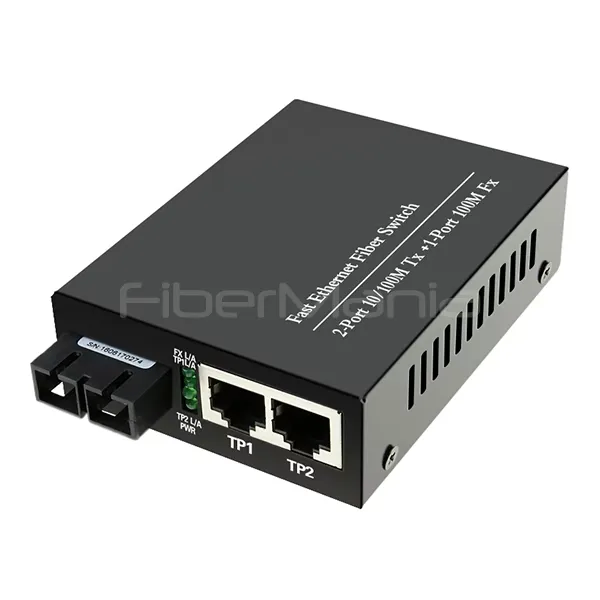 Fiber media converter with 10/100M support, 1310nm dual-fiber SC interface, 1 FX port and 2 RJ45 ports