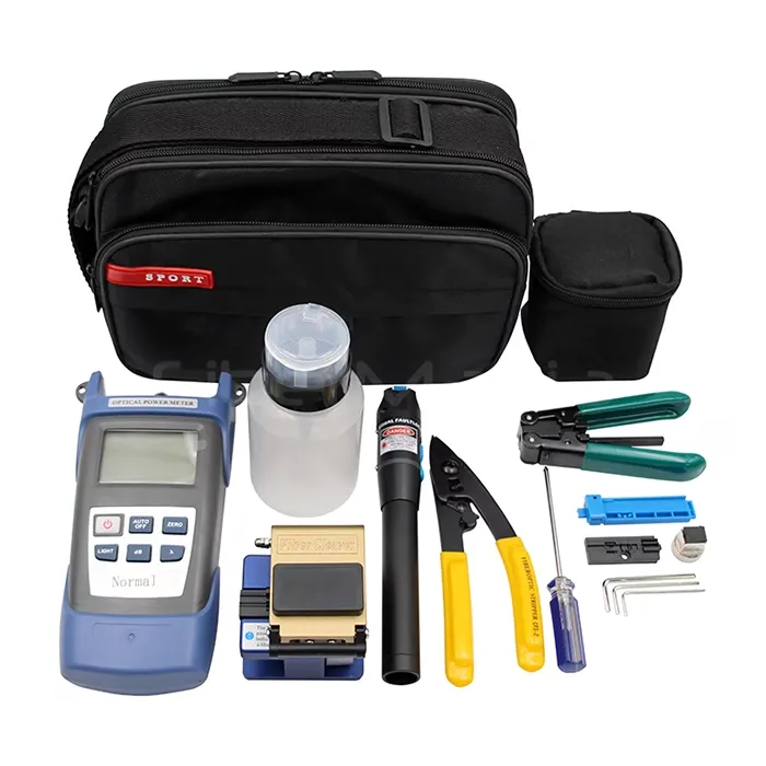 The kit includes an optical power meter capable of multi-wavelength testing, a visual fault locator for detecting line faults up to 5 km, and a fiber cleaver compatible with 250µm and 900µm fibers. Additional tools include CFS-2 fiber strippers, cable strippers for a variety of indoor and outdoor cables, a fiber length setter for precise cold splices, and an alcohol bottle for accurate cleaning of fiber end faces. This carefully curated set ensures accurate, safe, and efficient network setup while minimizing installation errors and downtime.