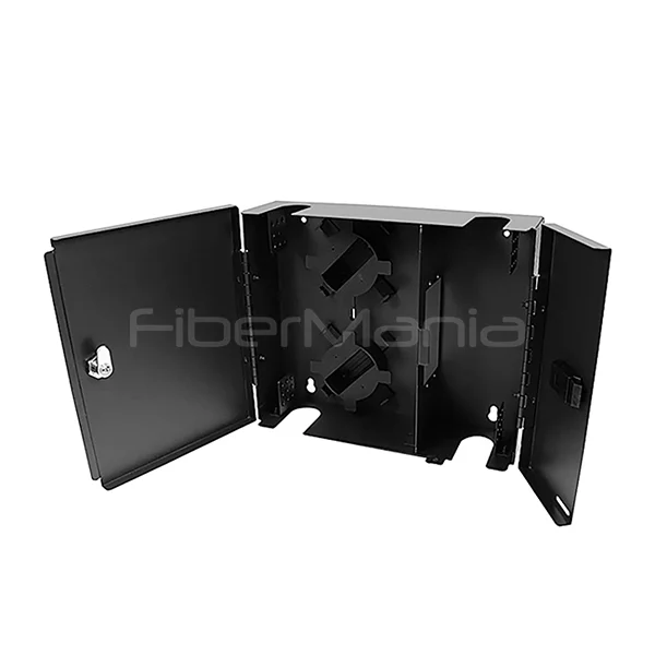 The FiberMania Wall Mount Fiber Enclosure with double doors is a compact solution for fiber patching and splicing, designed to optimize network management in limited spaces. This enclosure accommodates 2 LGX adapter panels, enabling flexible termination for a wide variety of fiber connector types.